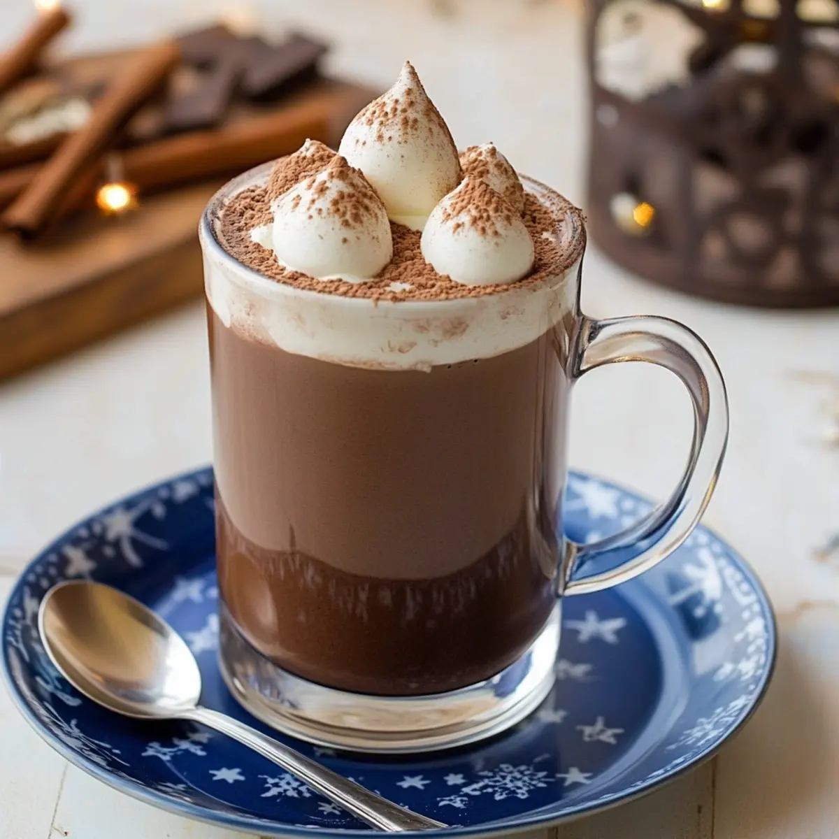 Serve: Ladle the hot chocolate into mugs. Top with a generous dollop of whipped cream, a sprinkle of cinnamon, and optional chocolate shavings for that extra indulgence.