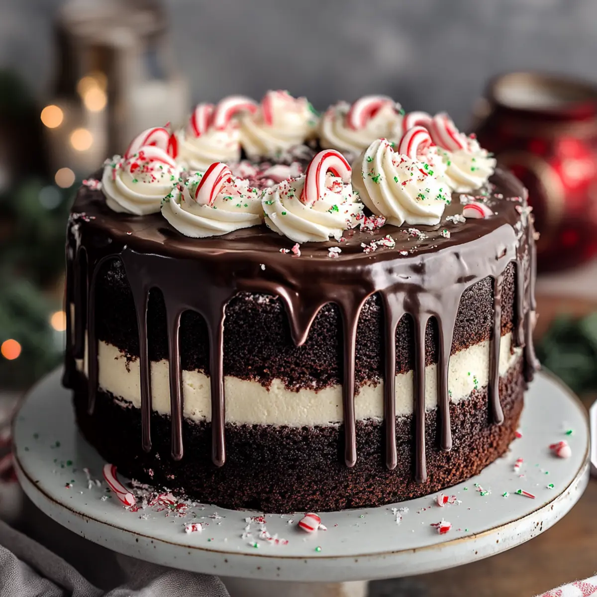 Decorate: While the ganache is still warm, drizzle it over the top of the decorated cake. Finish with crushed candy canes or peppermint bark for a festive touch.